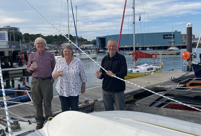Good news from GXSA member John Apps, who successfully completed another single handed Jester challenge sail to the Azores and has now returned. He left Plymouth on 21st June and reached Praia da Vitória (Azores) on 10th July. Had a bit of a rest and then sailed back, arriving in Penzance on 28th July. Here he is on 4th August meeting up with Bernie and Steve, who are in Plymouth on Burnadebt’s West Country cruise.